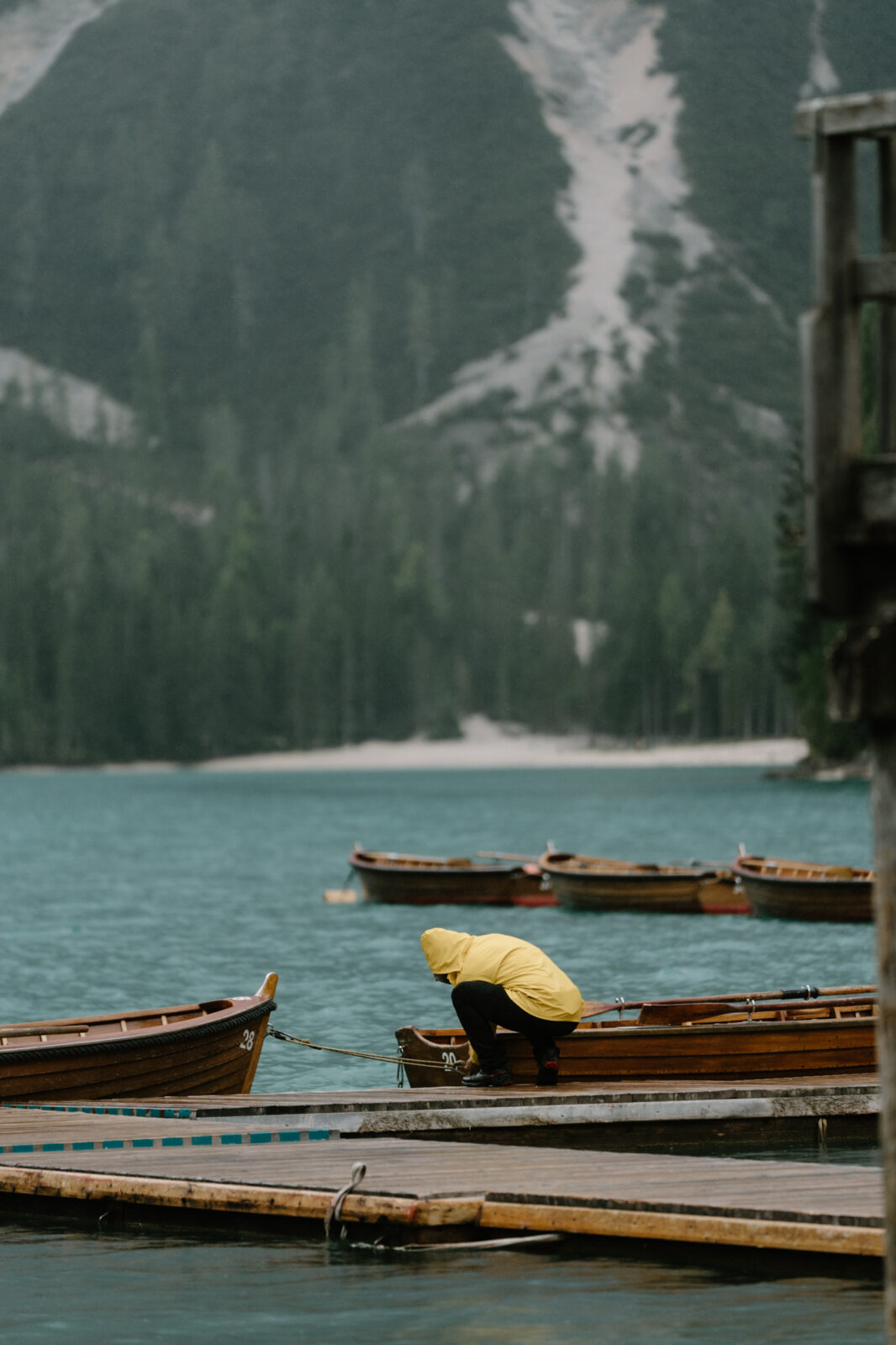 Planning a Lago di Braies elopement starts with one big decision: time of day. This lake is one of the most photographed spots in the Dolomites, and for good reason. But it fills quickly in summer. Sunrise is everything here. The light is softer, the wind is calmer, and you’ll avoid the tour buses that start arriving mid-morning. If privacy matters to you, aim for a weekday and shoulder season – late June, or late September into October when the larches begin to turn.