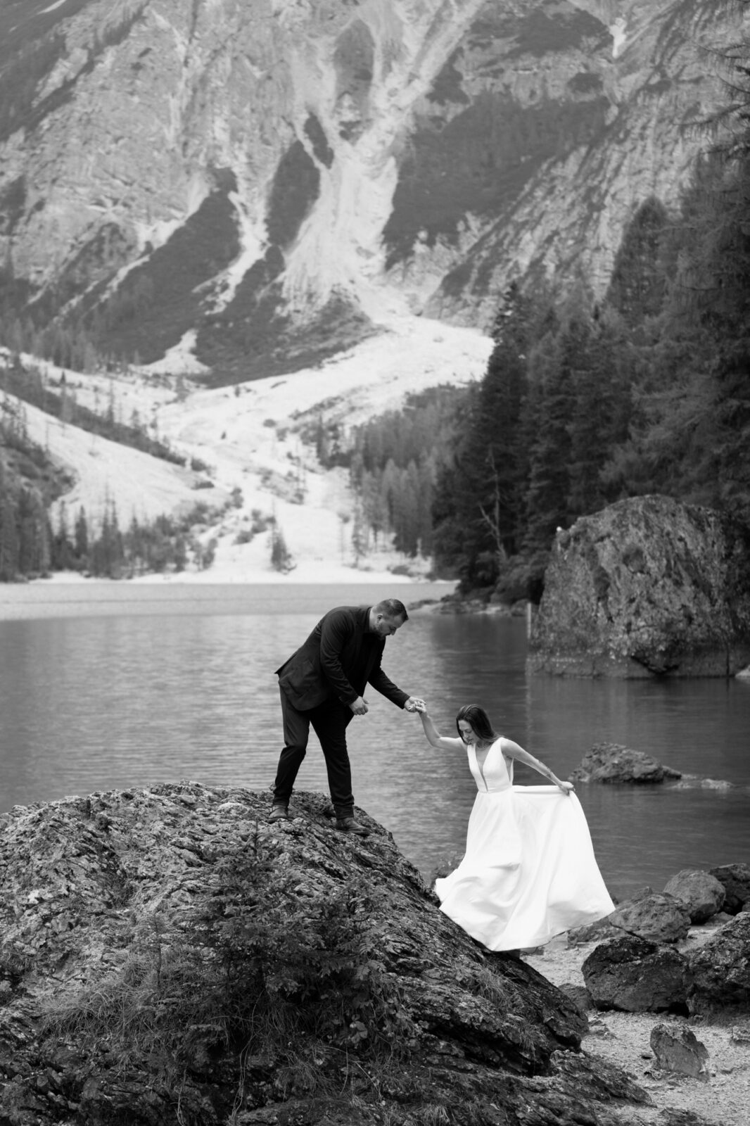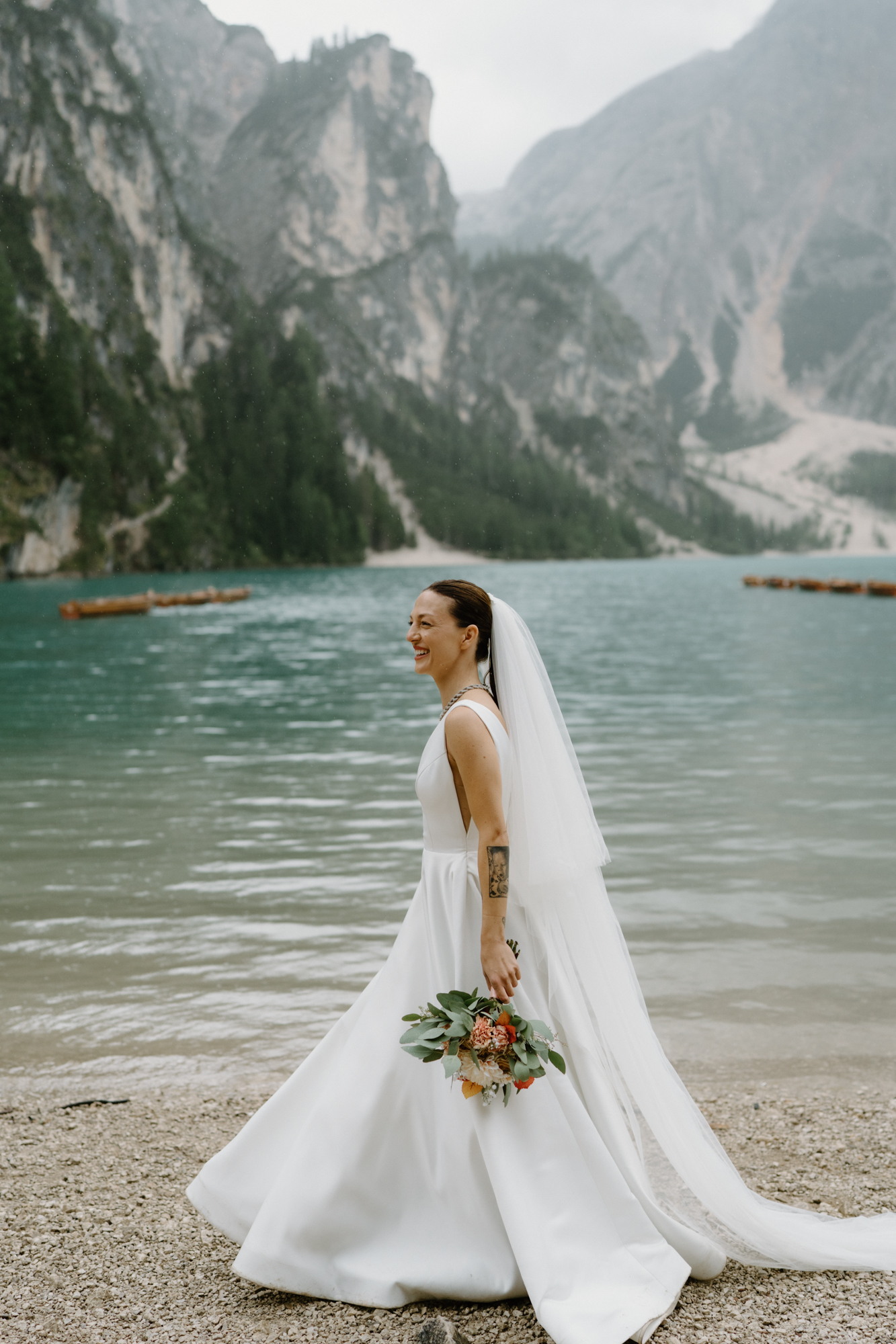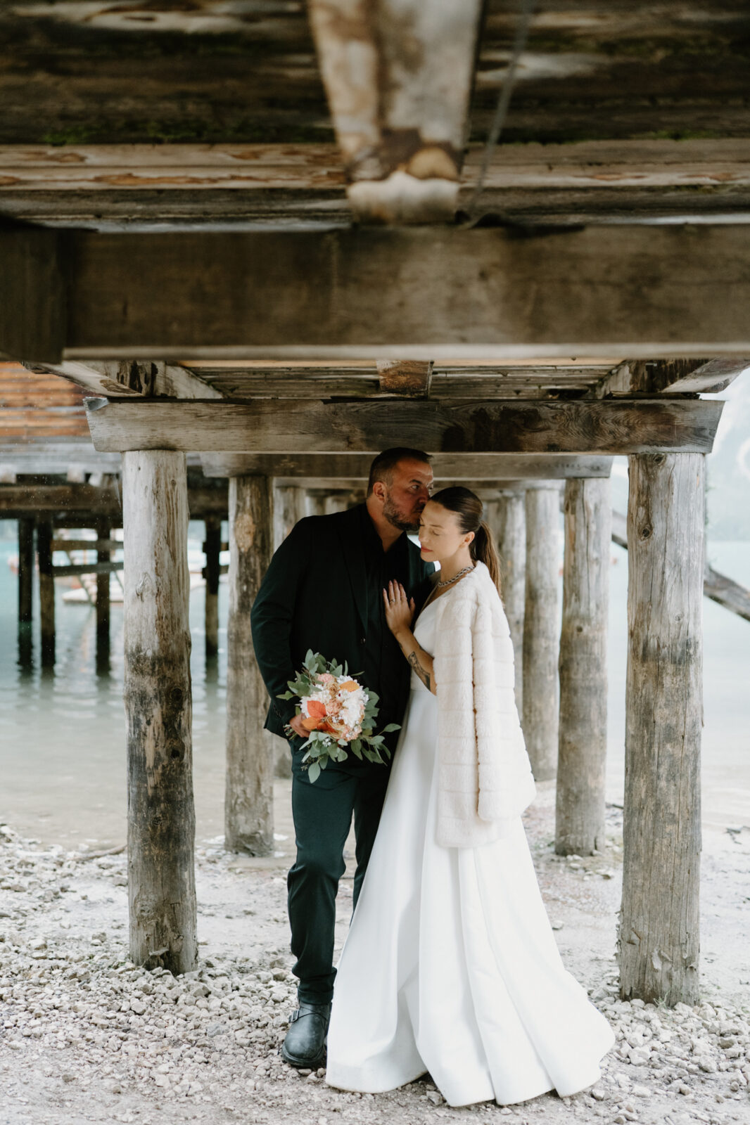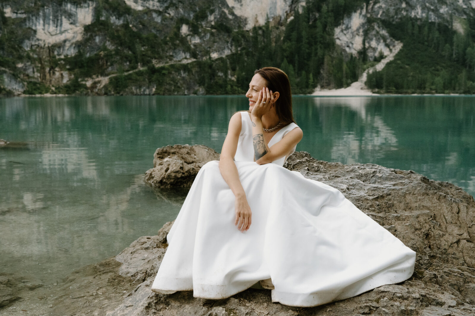 Access is straightforward, which makes it ideal for couples who want epic scenery without a strenuous hike. There’s a parking area near the lake (though restrictions apply in high season), and the walking path around the water is mostly flat and manageable in wedding attire. If you’re dreaming of those iconic wooden rowboats, they operate seasonally and typically open mid-morning. If you want photos on the water, we’d either plan for later light or build the day around sunrise portraits first and boats second. Keep in mind that Lago di Braies sits within the Fanes-Sennes-Braies Nature Park, so respecting local regulations and checking current access guidelines is part of the planning process.